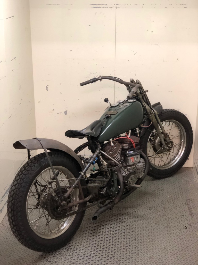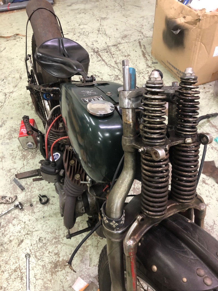 で、聞いていたらSAND FLATSの為にハンドルを作りたい云々だったので、一度見て見る事に。持ってきたバイクを見て結構私のストライク!早速色んな部品を当てて見て、大体のプランが決まってコーヒーと唐揚げの差し入れを持って遊びに来てくれました。・・・ワクチン接種当日であまり重労働ダメなのに(笑)