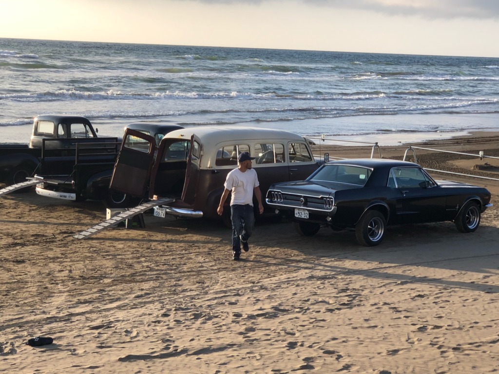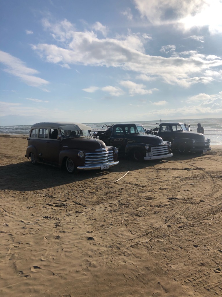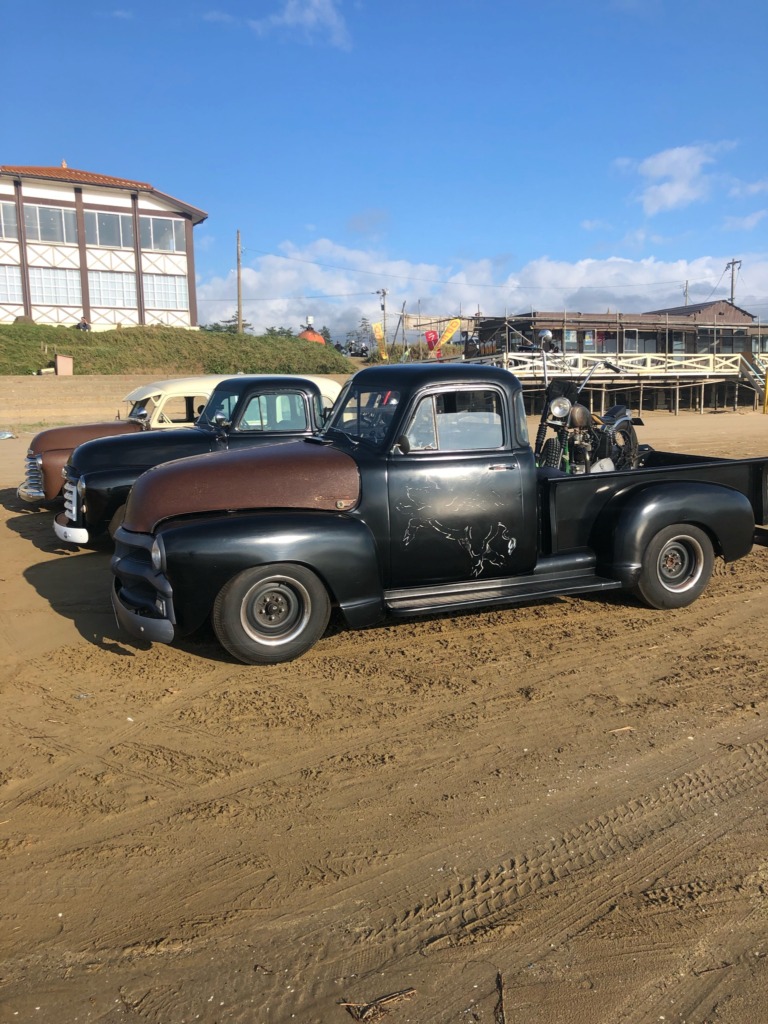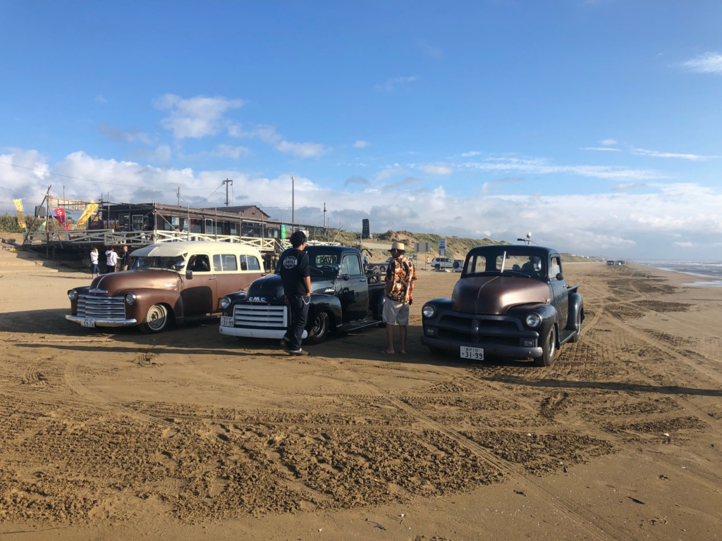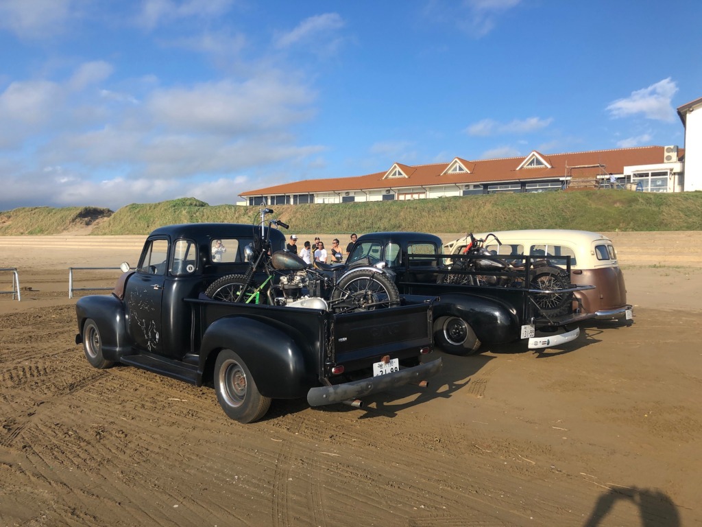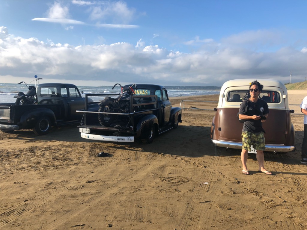遠くでは、プロモーションの撮影という事で、かっこいい車とバイクが集合しています! かっこいいけどガラ悪っ!などと酔っ払い2人で毒付きながら、ひと時のバカンスを楽しみます。ドクターは先週の週末にインディアンが壊れて乗るものが無い…。持ってるバイク全部壊れてる…可哀想に。