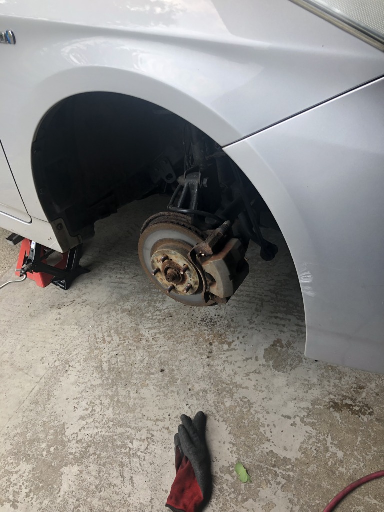 さ〜ここからが本番。ボールジョイントをアームから外します。YouTube先生によると、ハンマーで叩くのが素人的に簡単らしい。でも事前に従兄弟からはプリウスはアームがアルミだから直接叩いてはいけないのと、まー抜けないと思う!って言う事を整備のおじさんに聞いてもらった事前情報が有ったのでラスペネを惜しまず浸透させて置きます。その間にスタビライザー関係を先にやっちゃいます。
