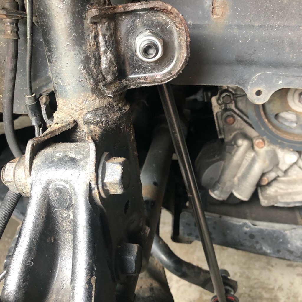 なかなか錆びてます!が、思ったほどでもない…。早速バラしていくと、ロアアームボールジョイントのクラウンナットが緩まない…。ちょっとラスぺネけちったせいか…😅 結局なめてしまったのでバイスで挟んで回そうとしたら、クラウンナットの飛び出た部分が割れてしまった😭