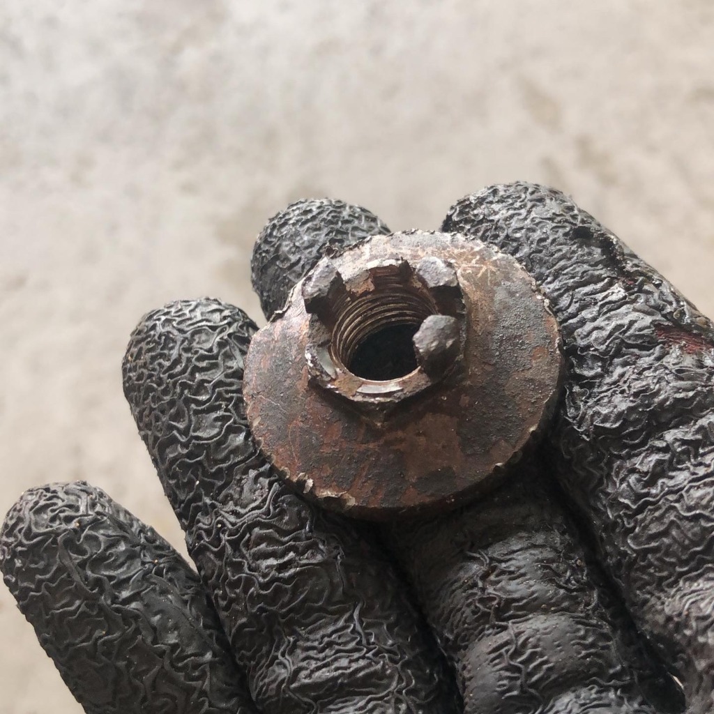 クラウンナットって王冠みたいな形をしているからクラウンナットって言うんですね〜。ネット調べで言うと、このナットを使っているって事はピンでロックさせるのでそんなにトルクを掛けて締める部分じゃ無いので外れ易いって言うじゃ無いですか!でも外れません😭 タガネで叩きまくってなんとかハズレましたが、初めての部位なので慎重だったせいもあり、これで午前の大半を使ってしまった…。