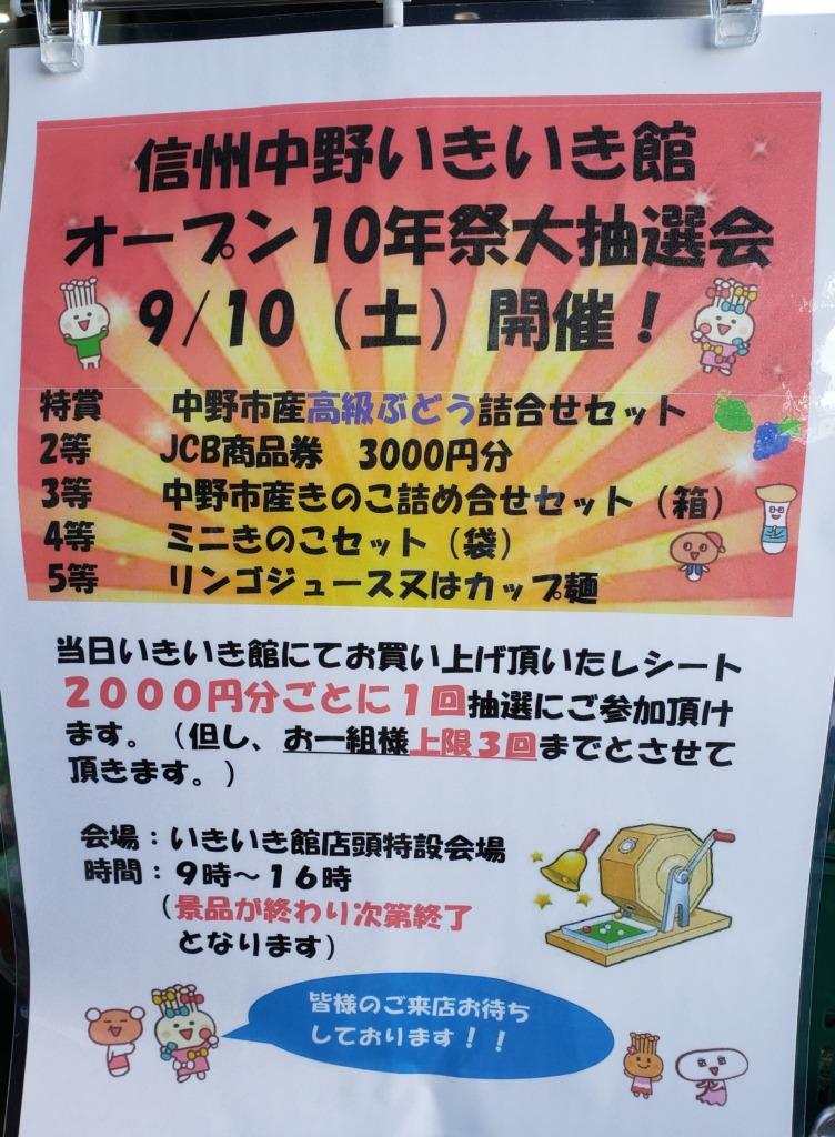 たまたま訪れた日に、「信州中野いきいき館」で当日買い物をしたレシート2000円ごとに1回できる(1組上限3回まで)ガラポン抽選会をやっていて、店外には凄い行列。店内にも多くの人がいました。